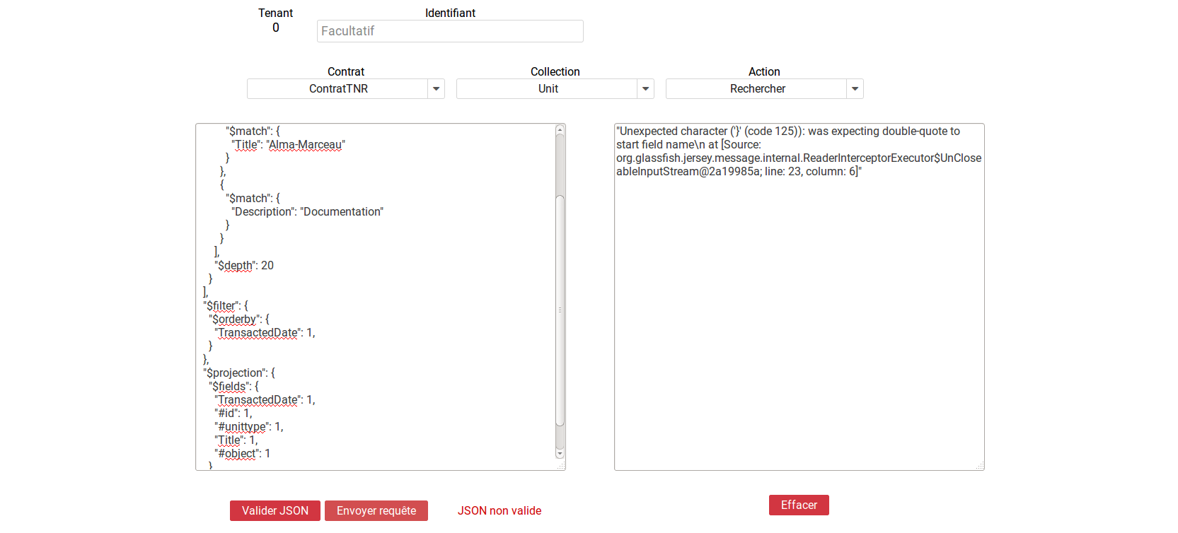 Si la requête envoyée par l’administrateur ne respecte pas le formatage de la requête Json, l’endroit où se trouve l’erreur sera indiqué dans le retour de la façon suivante :
