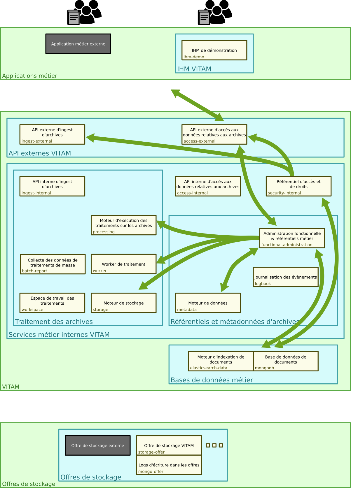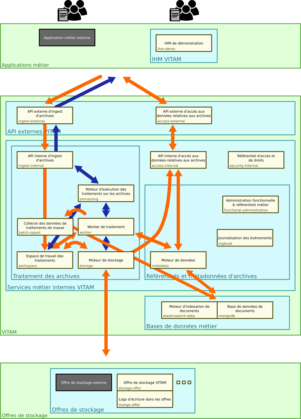 La solution logicielle VITAM est découpée en services autonomes interagissant pour permettre de rendre le service global ; ce découpage applicatif suit en grande partie le découpage présenté plus haut dans l’architecture fonctionnelle.