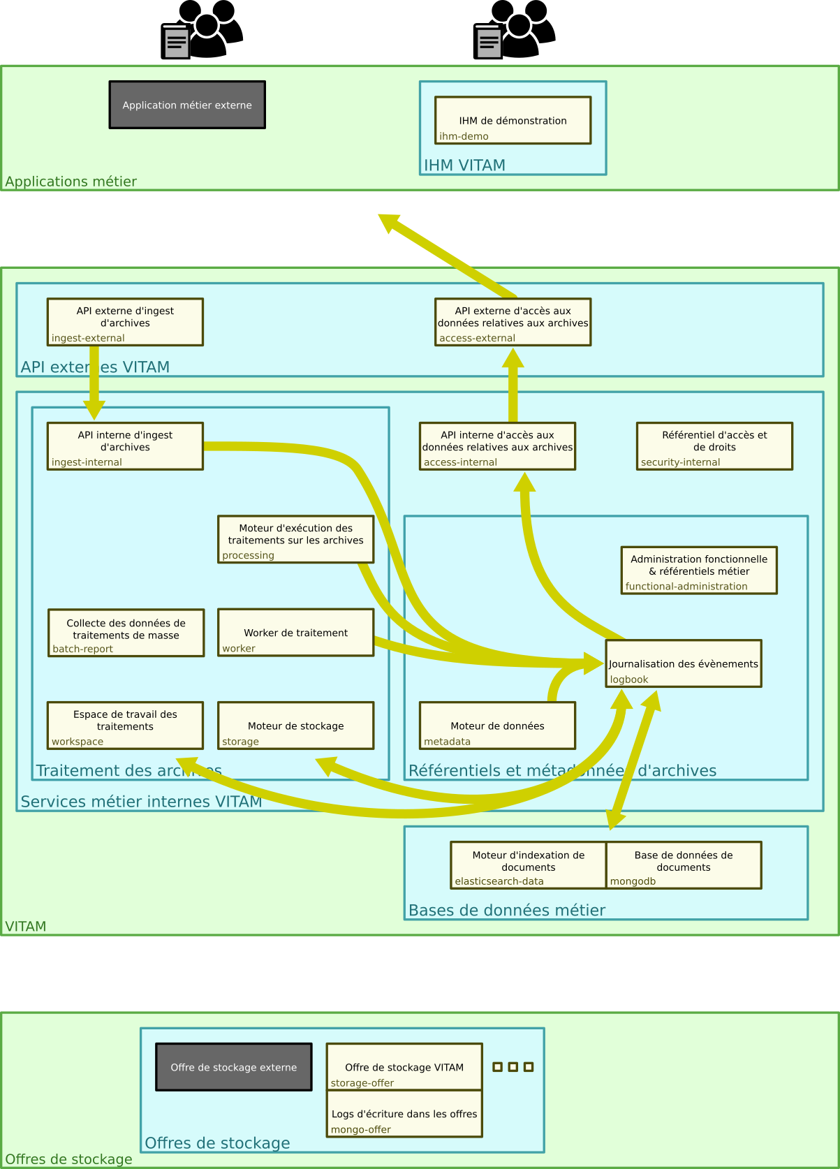 Les schémas suivants présentent l’architecture applicative et les flux d’informations entre composants. Tous les composants qui sont en jaune, sont fournis dans le cadre de la solution logicielle VITAM ; tous sont requis pour le bon fonctionnement de la solution, à l’exception de deux d’entre eux : ihm-demo et storage-offer-default (selon les choix de déploiement). Enfin, chaque service possède un nom propre qui l’identifie de manière unique au sein de la solution logicielle VITAM.