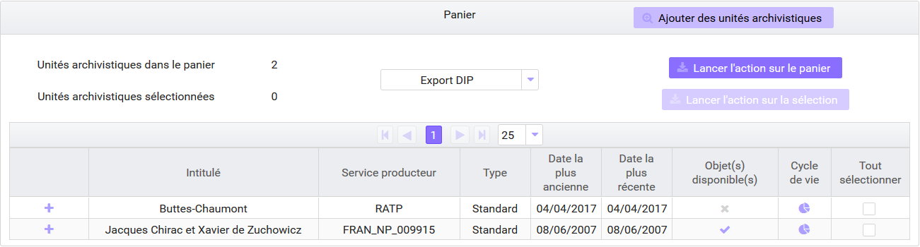 Depuis l’IHM standard, il est également possible de demander à générer un DIP du panier ou d’une sélection présente dans le panier. Le panier permet de constituer un DIP avec des unités archivistiques de services producteurs différents ; par défaut, le nom du service producteur figurant dans le bordereau du DIP (balise ManagementMetadata) sera une valeur définie par configuration.