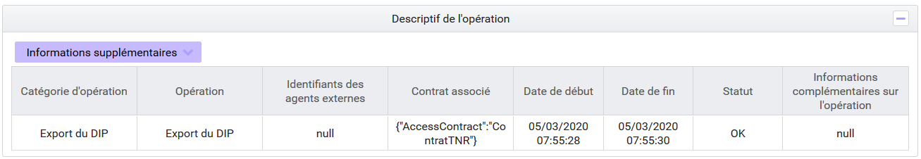 L’opération est journalisée. Suivant l’activation ou non de la fonctionnalité dans le contrat d’accès associé à la demande de génération du DIP, l’opération sera tracée dans les logs d’accès.