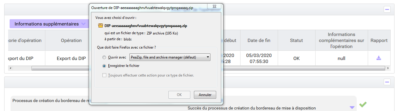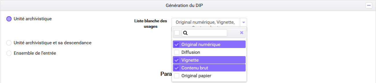Dans l’état actuel des développements de la solution logicielle, la fonctionnalité de filtre du DIP sur un type d’usage n’est pas présente dans le panier. Tous les usages autorisés par le contrat d’accès associé à la demande de génération du DIP sont exportés.