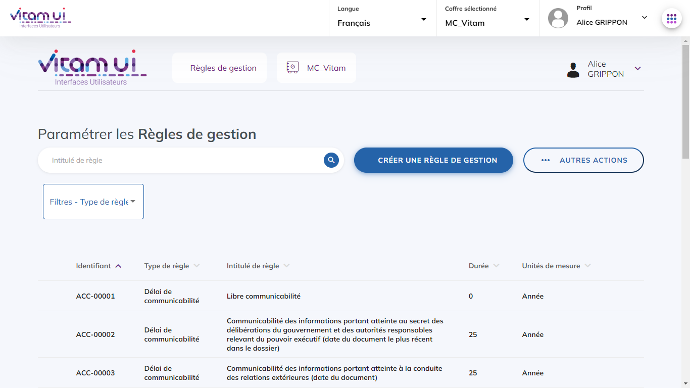 L’utilisateur doit importer un référentiel des règles de gestion via l’APP Règles de gestion. Le référentiel des règles de gestion est propre à chaque coffre de la plate-forme.