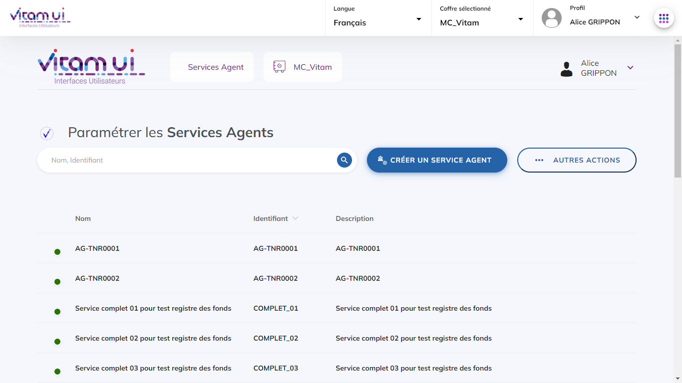 La deuxième étape consiste à importer un référentiel des services agents* au format .csv dans la solution logicielle Vitam via l’APP Services agents. Ce référentiel a pour vocation d’être utilisé par la solution logicielle Vitam pour effectuer localement les contrôles des services (producteurs ou versants) déclarés par les administrateurs et les utilisateurs en entrée et en accès. Le référentiel des services agents est propre à chaque coffre de la plate-forme.