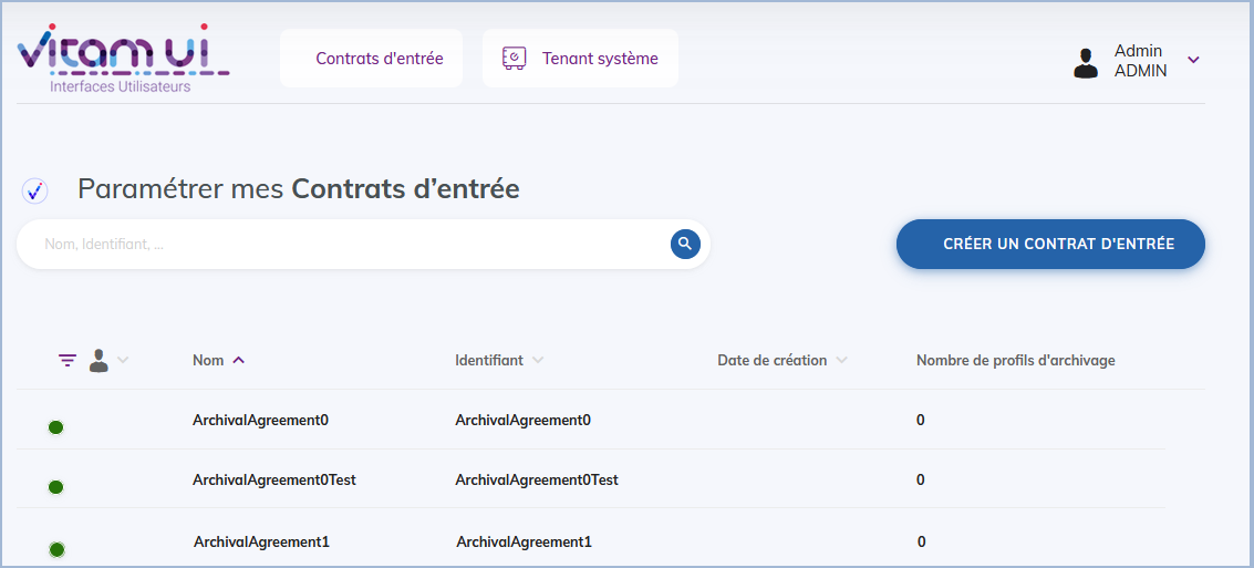 Enfin, ce dernier point, facultatif, consiste à créer un contrat d’entrée* via l’APP VitamUI « Contrats d’entrée ». Un contrat d’entrée est propre à un coffre.