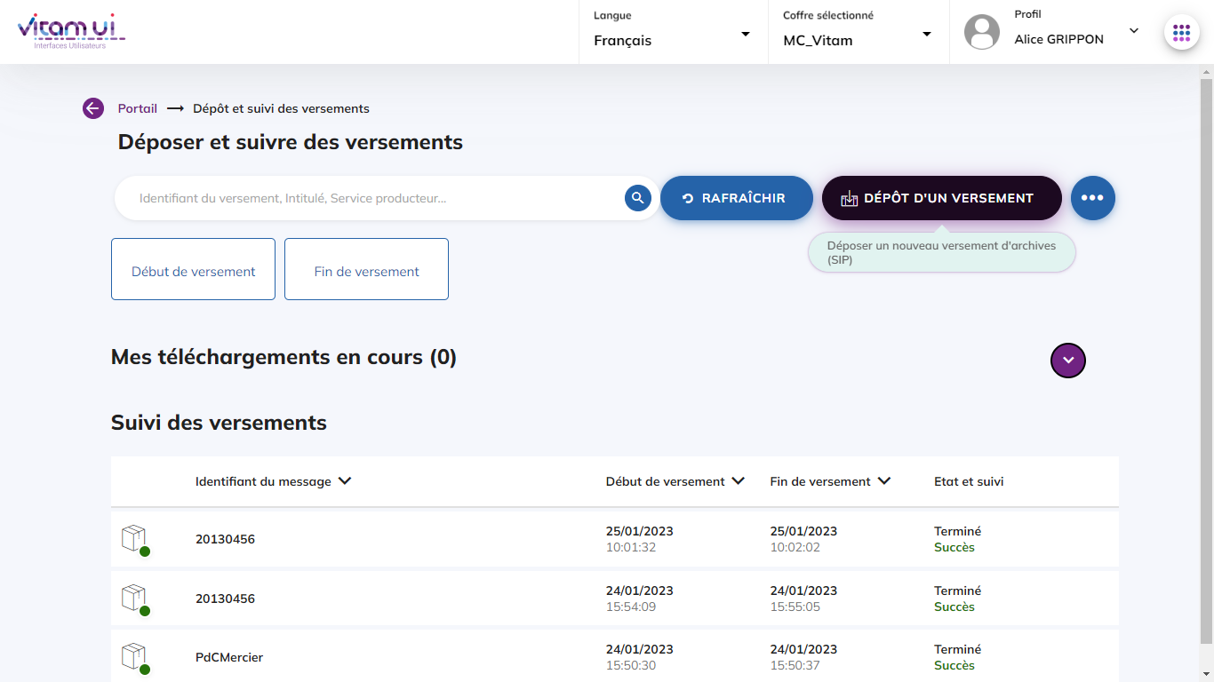 L’utilisateur peut ensuite importer le SIP dans la solution logicielle Vitam, via l’APP « Dépôt et suivi des versements ».