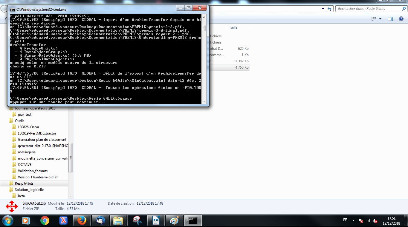 Une fois l’opération de génération du SIP terminée, la fenêtre de dialogue invite l’utilisateur à appuyer sur la touche « Entrée » pour la fermer. Le SIP généré est enregistré dans le répertoire Resip, sous la forme d’un fichier dont l’extension est .zip (cf. copie d’écran ci-dessous).