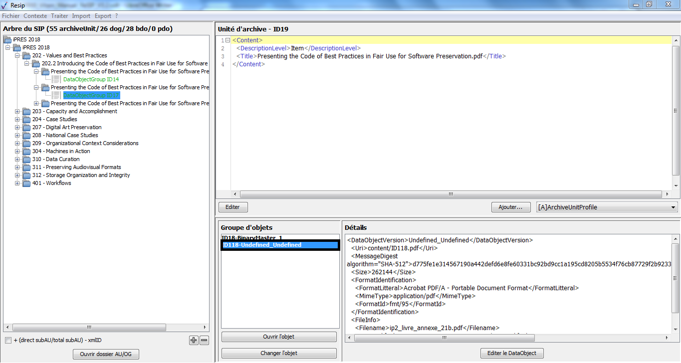 Nous vous invitons également à prendre connaissance du billet de blog du SIAF daté du 30 septembre 2019 et intitulé « Trois outils contribuant à l’archivage numérique » : il vous permettra de voir d’un seul coup d’œil les fonctionnalités de ReSIP en lien avec deux autres outils, Archifiltre et Octave. Ce billet est consultable en suivant ce lien : https://siaf.hypotheses.org/1033[1].