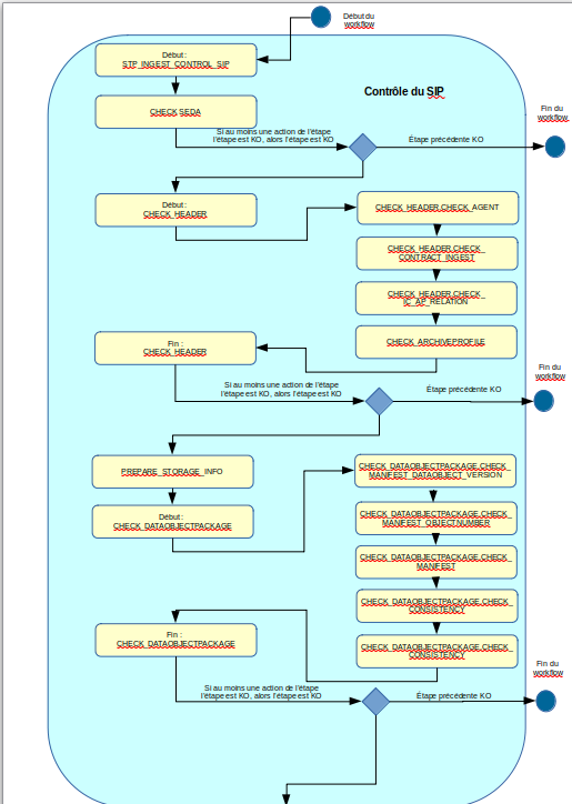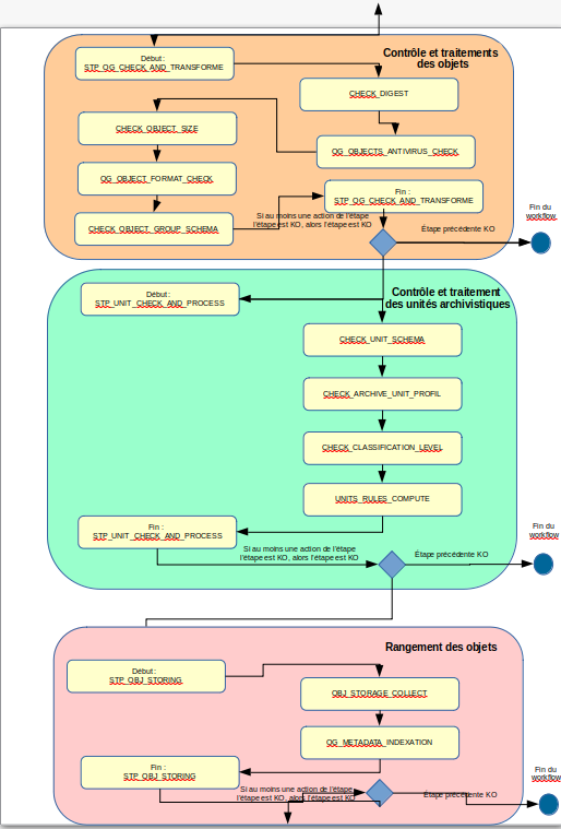 Le workflow actuel mis en place dans la solution logicielle Vitam est défini dans le fichier « DefaultFilingSchemeWorkflow.json ». Ce fichier est disponible dans : sources/processing/processing-management/src/main/resources/workflows. D’une façon synthétique, le workflow est décrit ainsi :