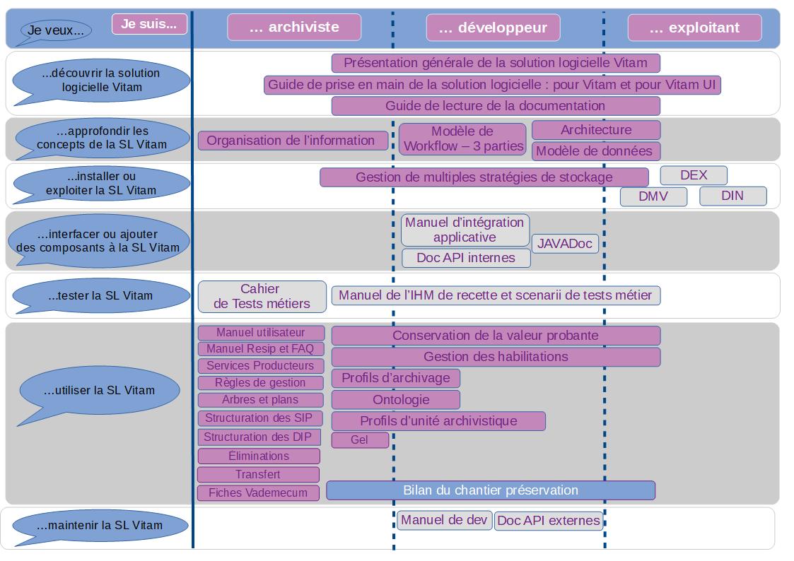Le document comporte une carte apportant une vision globale croisant ces trois axes (utilisateur/besoin/documentation) et une fiche signalétique de chaque document produit par le Programme Vitam, comportant sa description, le public ciblé, le lien pour consulter le document et une extraction du sommaire. Il est conseillé de consulter les documents du général au particulier, dans l’ordre de la démarche présentée par le schéma suivant. Par exemple, pour un développeur, il est conseillé de consulter le document d’architecture avant le manuel d’intégration.