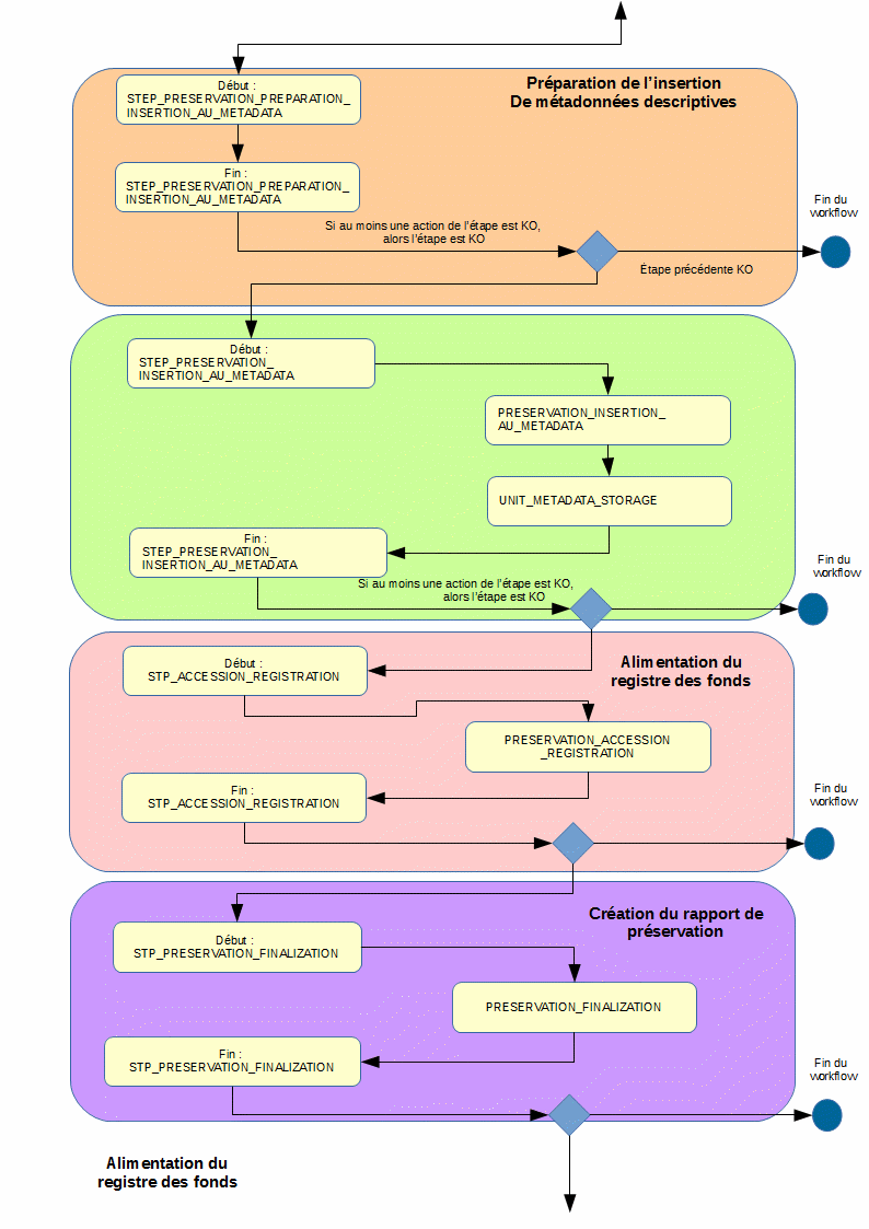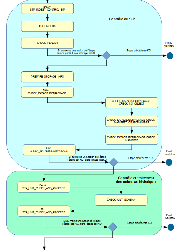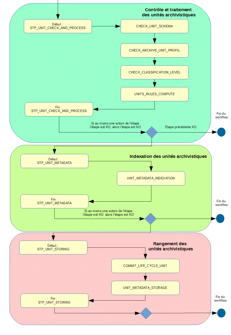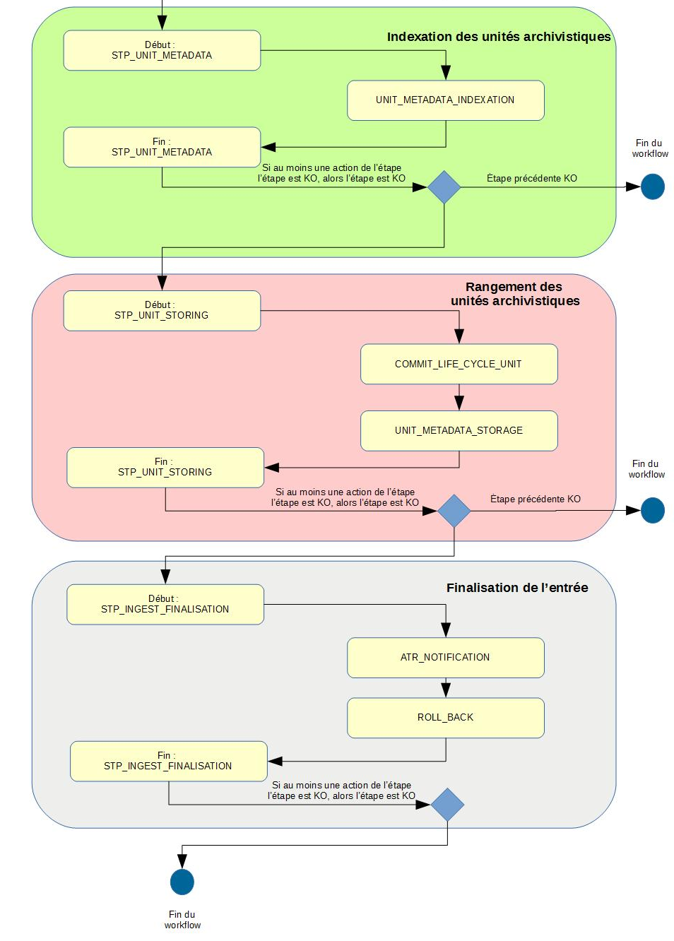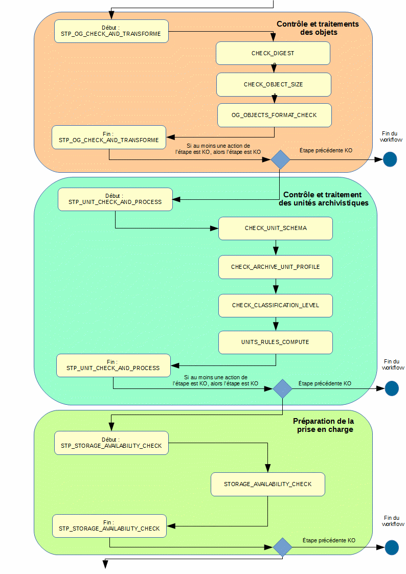 Le workflow actuel mis en place dans la solution logicielle Vitam est défini dans le fichier « DefaultFilingSchemeWorkflow.json ». Ce fichier est disponible dans : sources/processing/processing-management/src/main/resources/workflows. D’une façon synthétique, le workflow est décrit ainsi :