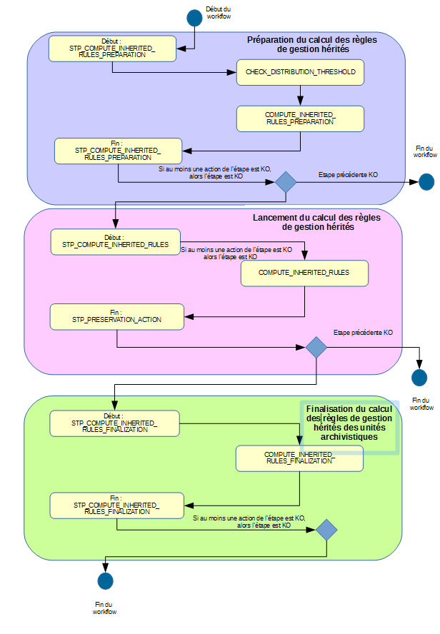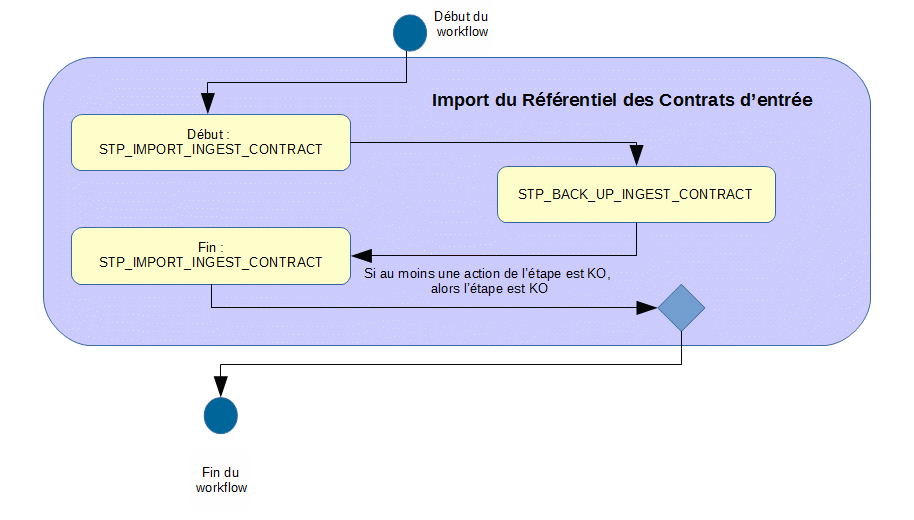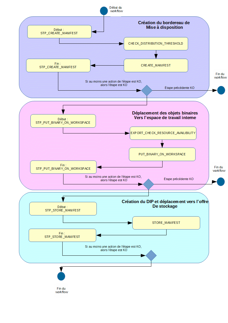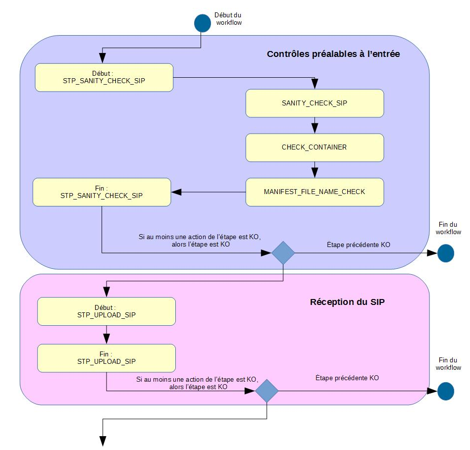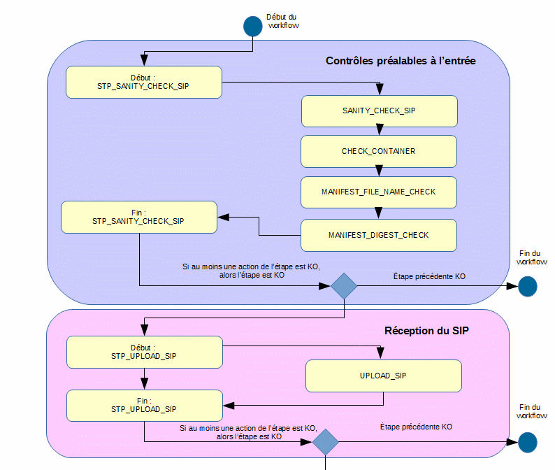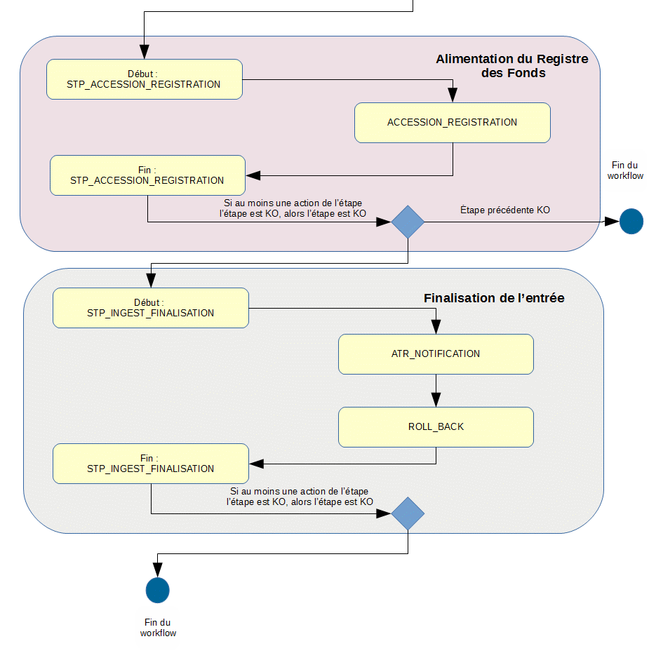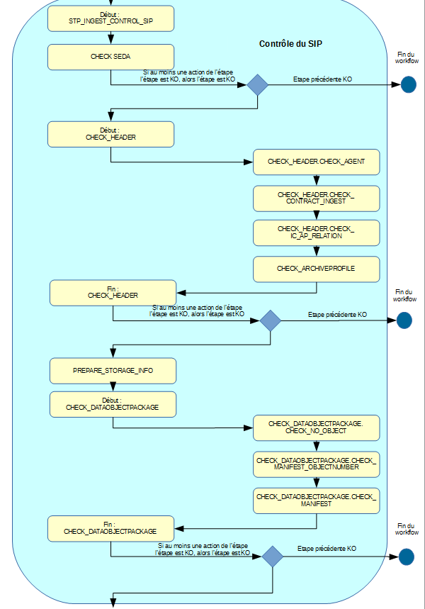 Le workflow actuel mis en place dans la solution logicielle Vitam est défini dans le fichier « DefaultFilingSchemeWorkflow.json ». Ce fichier est disponible dans : sources/processing/processing-management/src/main/resources/workflows. D’une façon synthétique, le workflow est décrit ainsi :