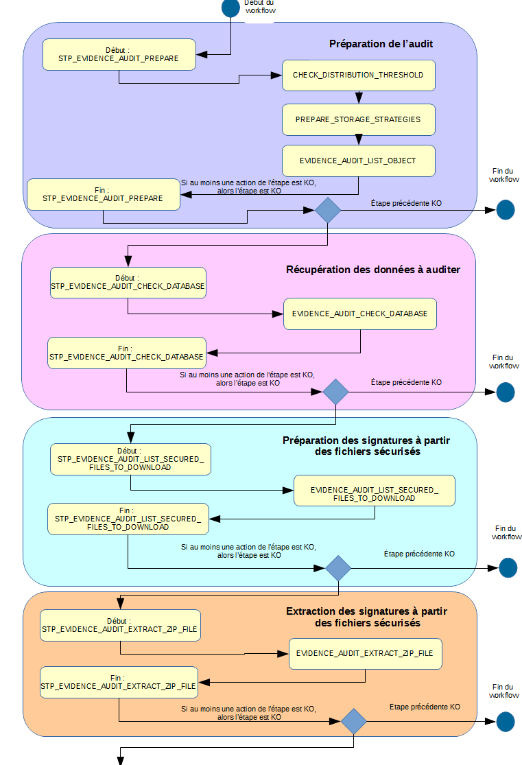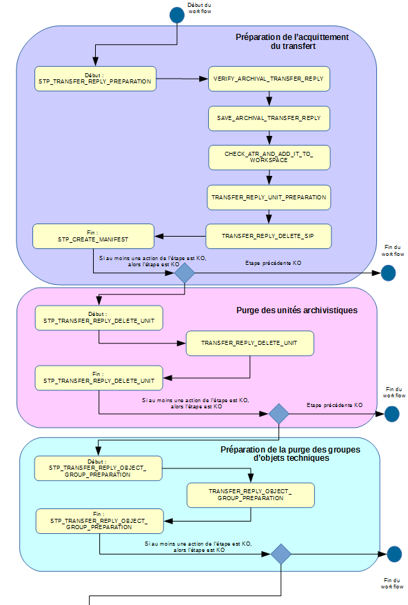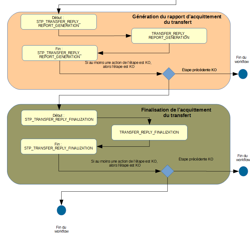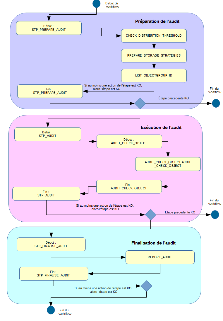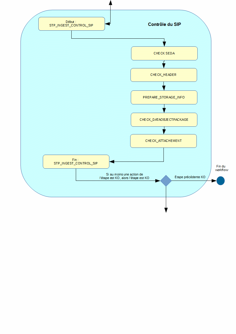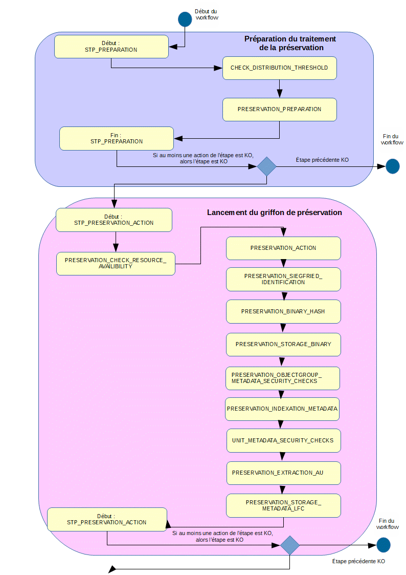 Le workflow actuel mis en place dans la solution logicielle Vitam est défini dans le fichier « DefaultFilingSchemeWorkflow.json ». Ce fichier est disponible dans : sources/processing/processing-management/src/main/resources/workflows. D’une façon synthétique, le workflow est décrit ainsi :