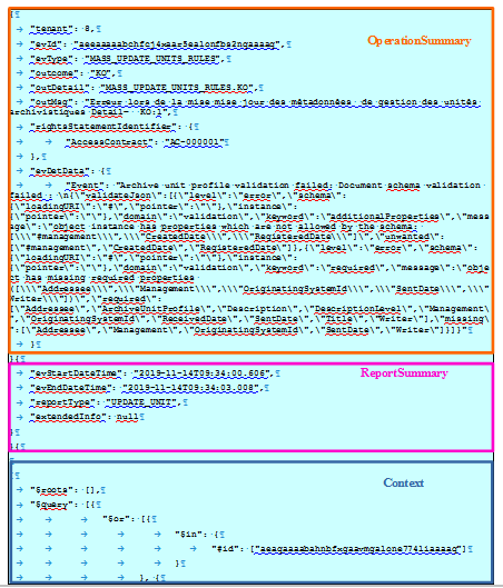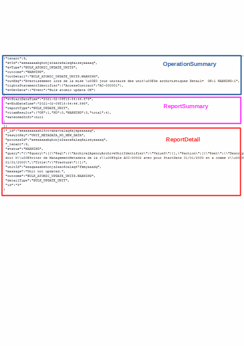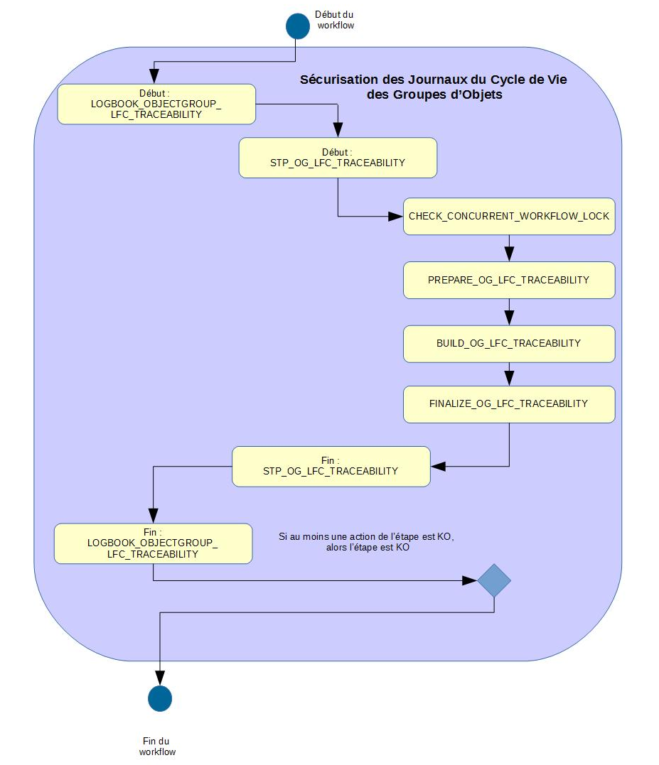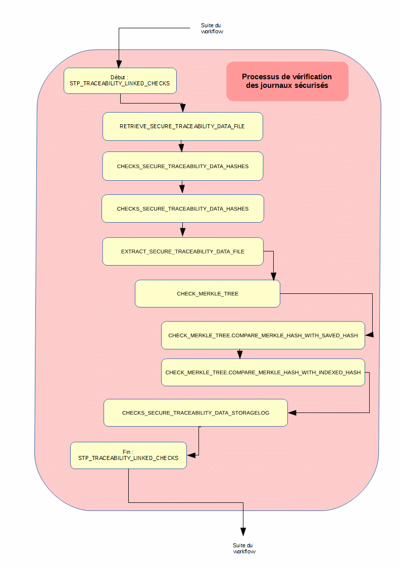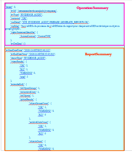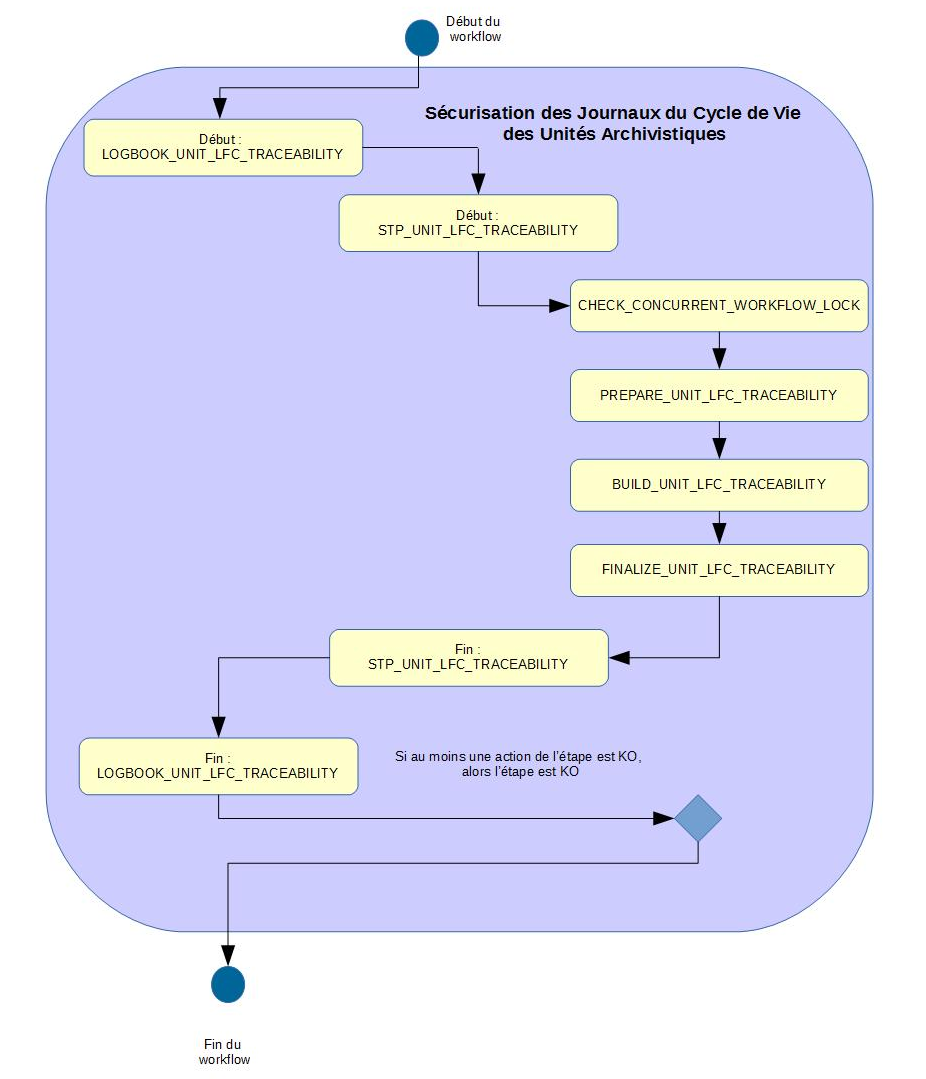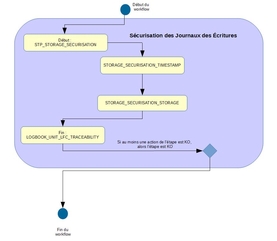 Toutes les étapes, tâches et traitements sont journalisés dans le journal des opérations et décrivent le processus (clé et description de la clé associée dans le journal des opérations) tel qu’implémenté dans la version actuelle de la solution logicielle Vitam.