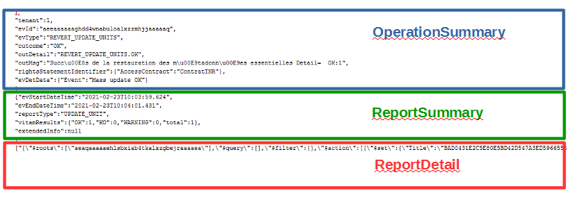 « vitamResults » : indique le nombre total d’objets traités lors de l’opération de suppression des versions des got et correspondant pour chacun des trois statuts, « OK », « KO » et « WARNING » et le « total » ;