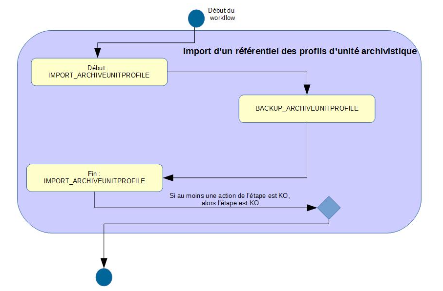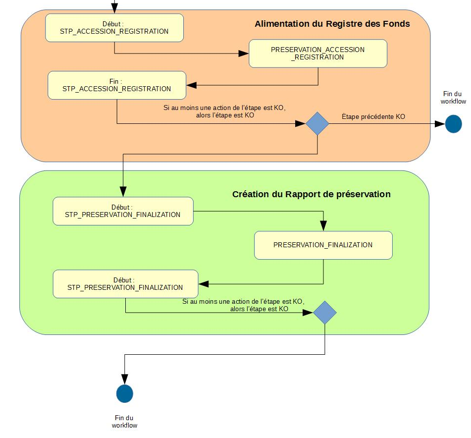 Un workflow peut être terminé, en cours d’exécution ou être en pause. Un workflow en pause représente le processus arrêté à une étape donnée. Chaque étape peut être mise en pause : ce choix dépend du mode de versement (le mode pas à pas marque une pause à chaque étape), ou du statut (le statut FATAL met l’étape en pause). Les workflows en pause sont visibles dans l’IHM dans l’écran « Gestion des opérations ».