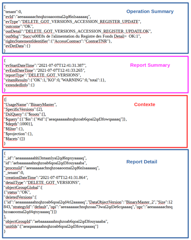 Le rapport de suppression des versions des groupes d’objets (got) est un fichier JSON généré par la solution logicielle Vitam lorsqu’une opération suppression des versions des groupes d’objets se termine. Cette section décrit la manière dont ce rapport est structuré.