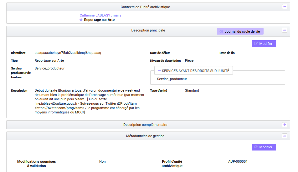 Modifier l’identifiant de la seconde notice descriptive de profil d’unité archivistique. |