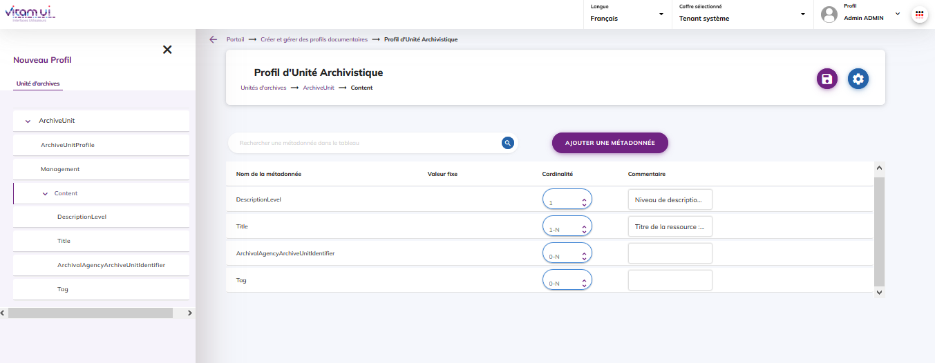 La solution logicielle Vitam intègre un référentiel des profils d’unité archivistique, administrable par un utilisateur doté des droits adéquats (administrateur fonctionnel et/ou technique) et géré dans une collection particulière[6].