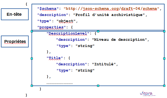 Les profils d’unité archivistique prennent la forme de fichiers au format JSON[1]. En termes de syntaxe et de grammaire, ils correspondent plus exactement à des schémas de contrôle, permettant de valider des contenus exprimés au format JSON, qui est le format de structuration des données utilisé dans la solution logicielle Vitam[2].