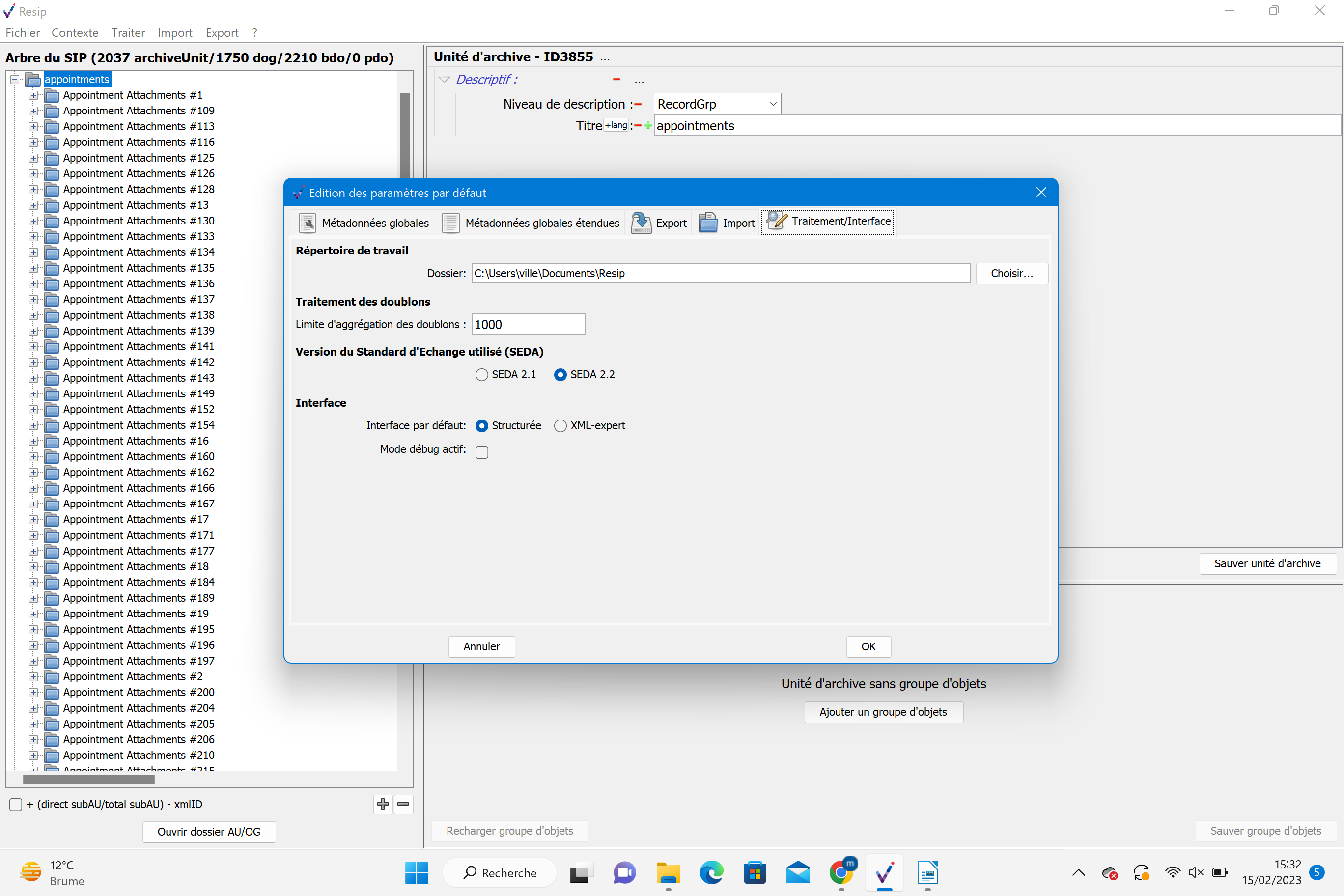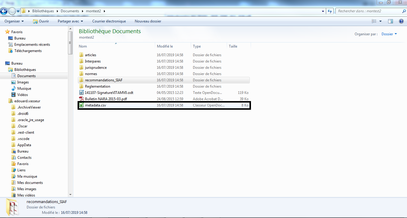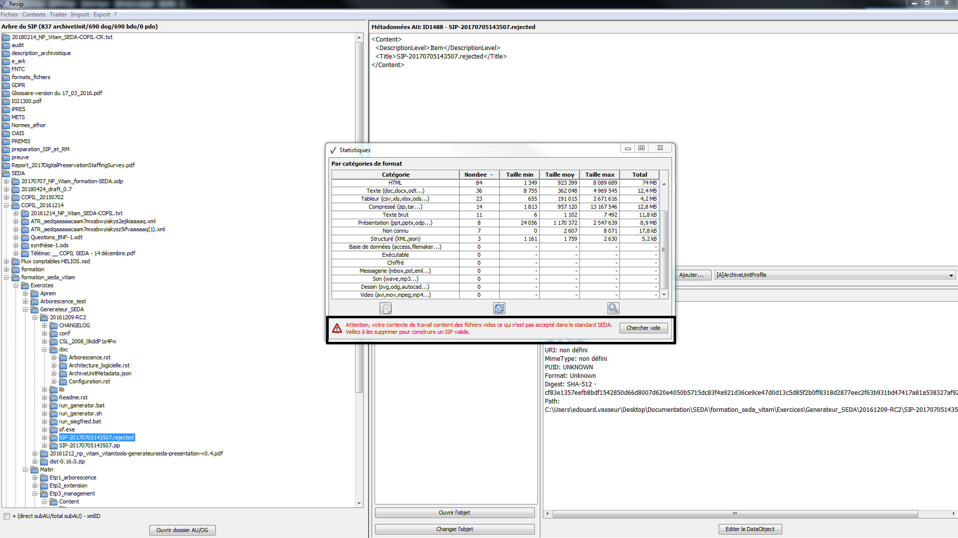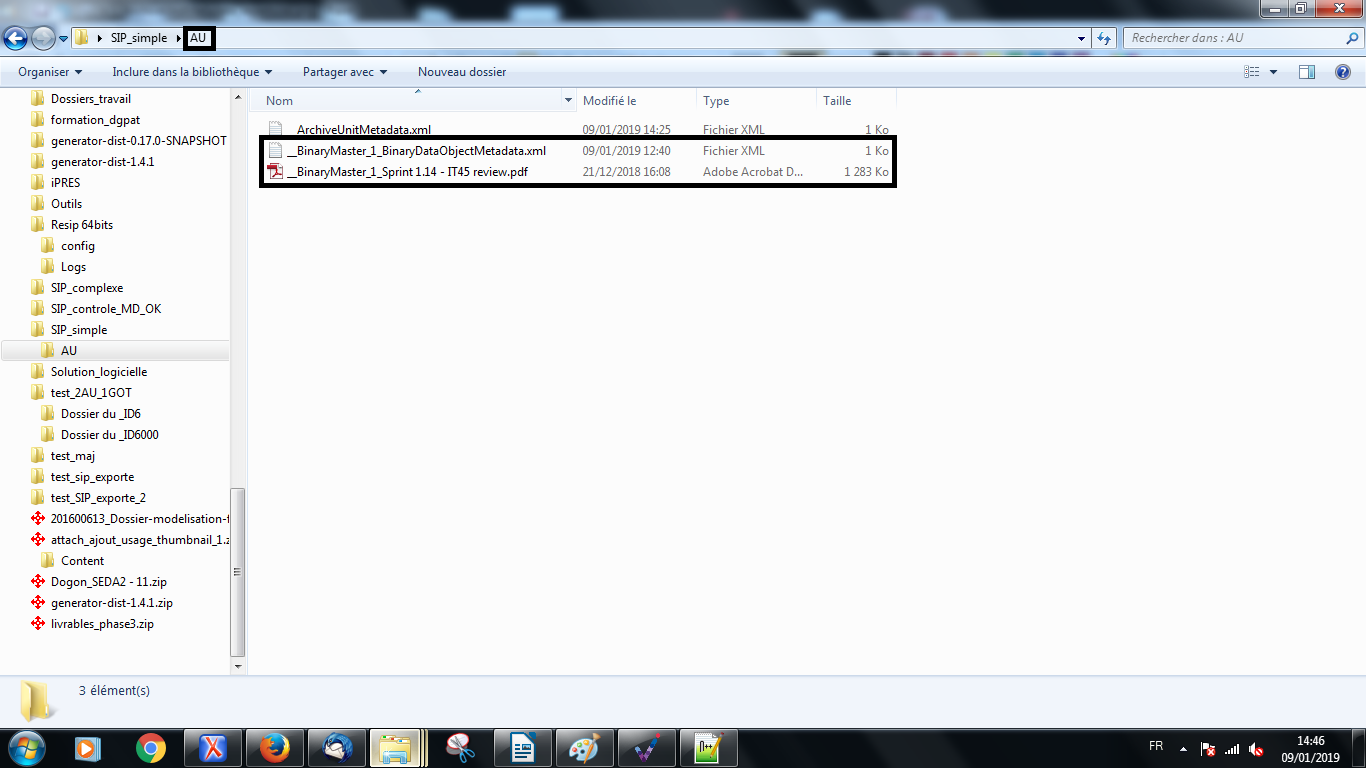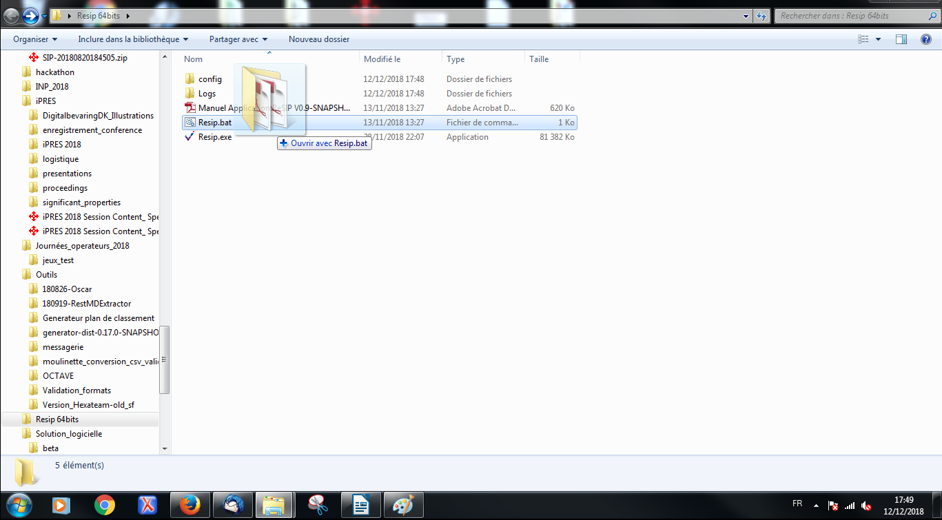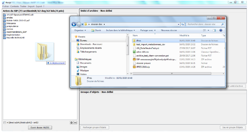 Comme avec le générateur SEDA, il est possible de générer automatiquement un SIP à partir d’une structure arborescente d’archives en faisant glisser un répertoire sur le fichier Resip.bat du répertoire Resip (cf. copie d’écran ci-dessous).