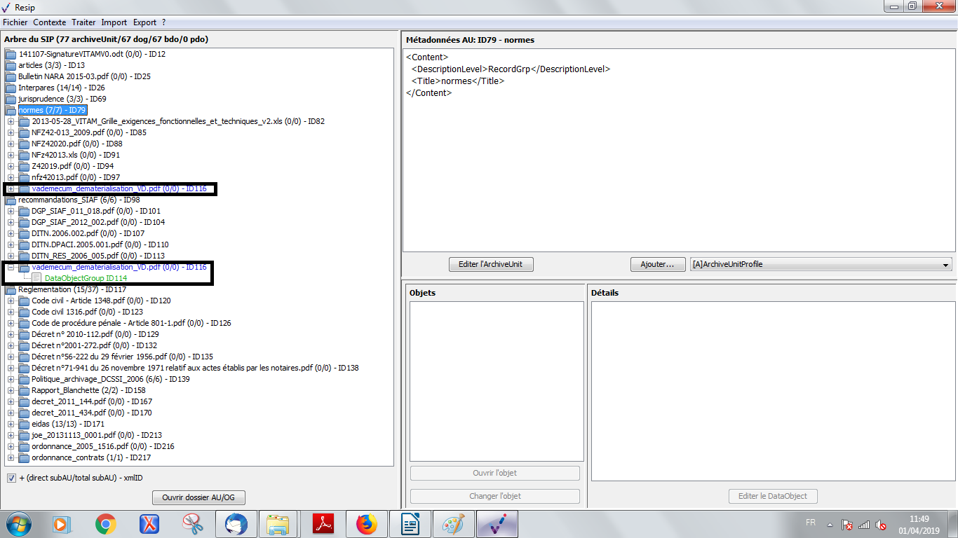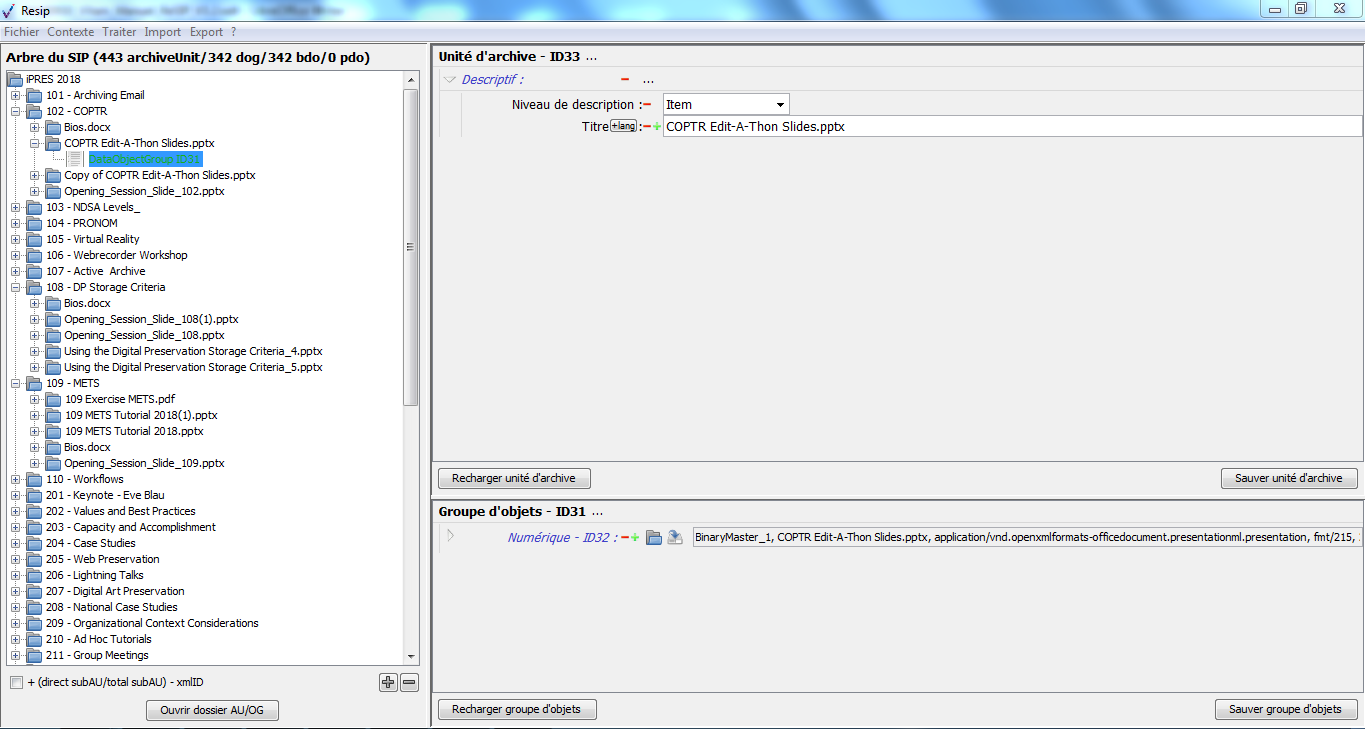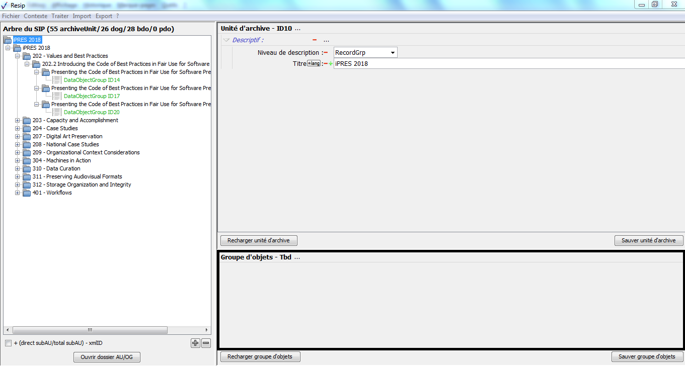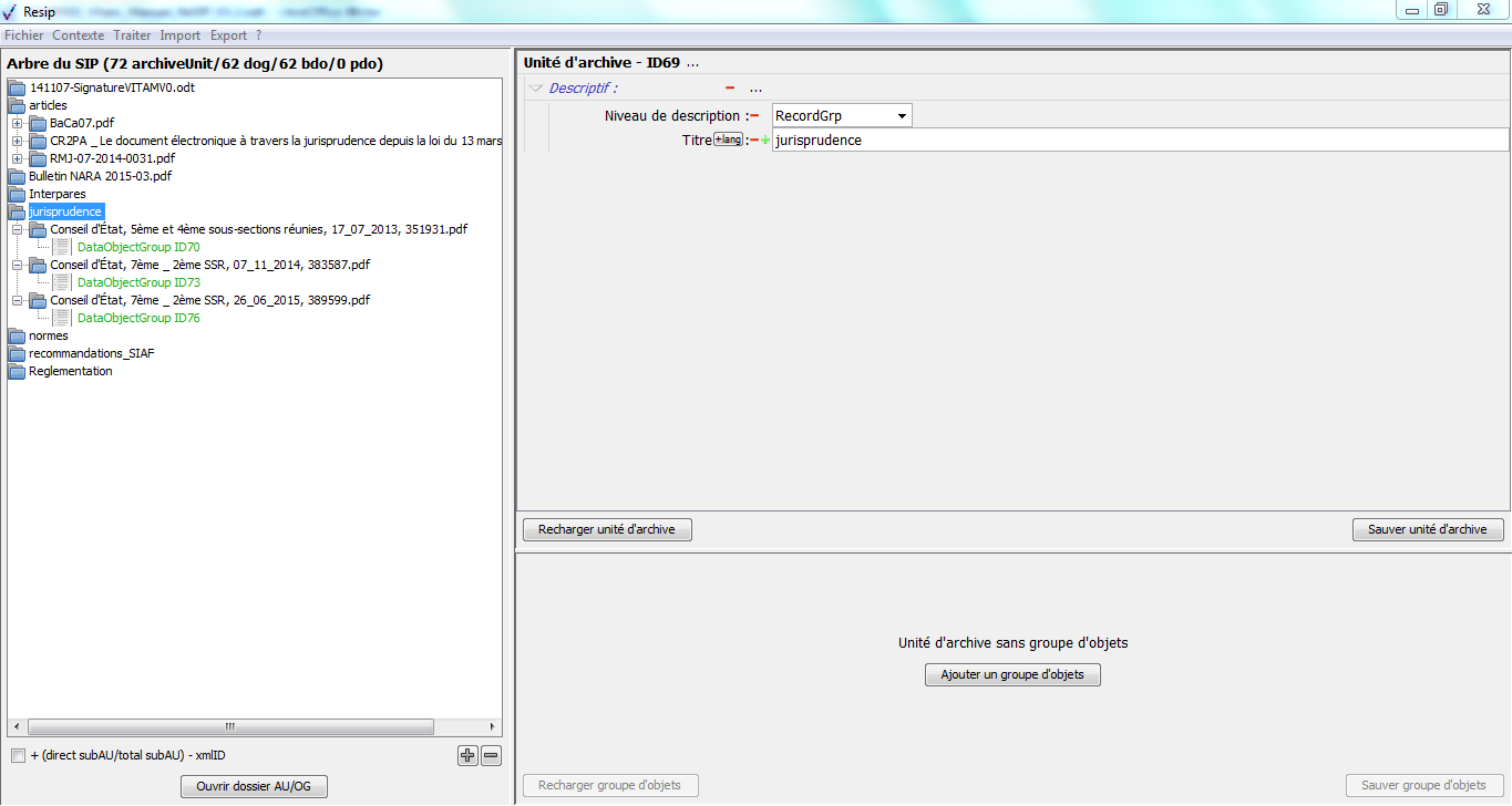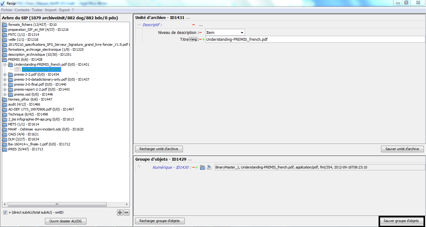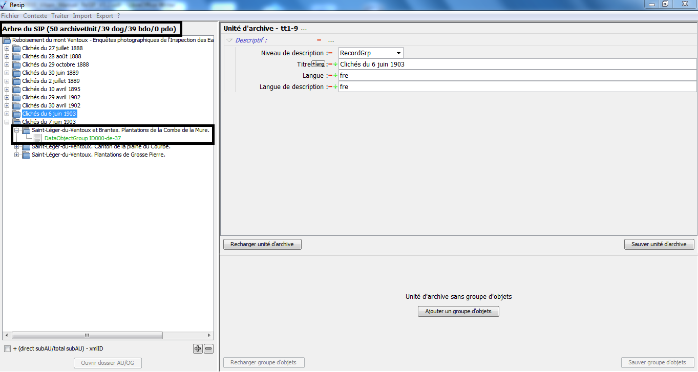 les DataObjectGroup rassemblent les BinaryDataObject et les PhysicalDataObject représentant une même archives (ex. une photographie représentée par un tirage analogique et un fichier numérique) ;