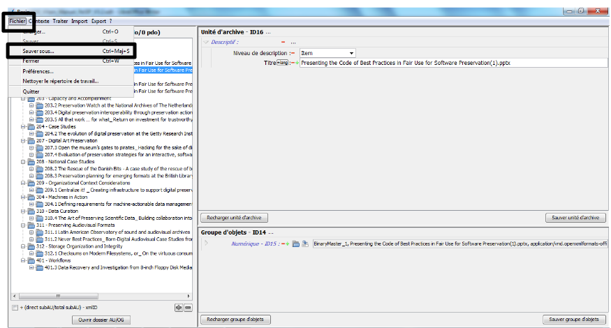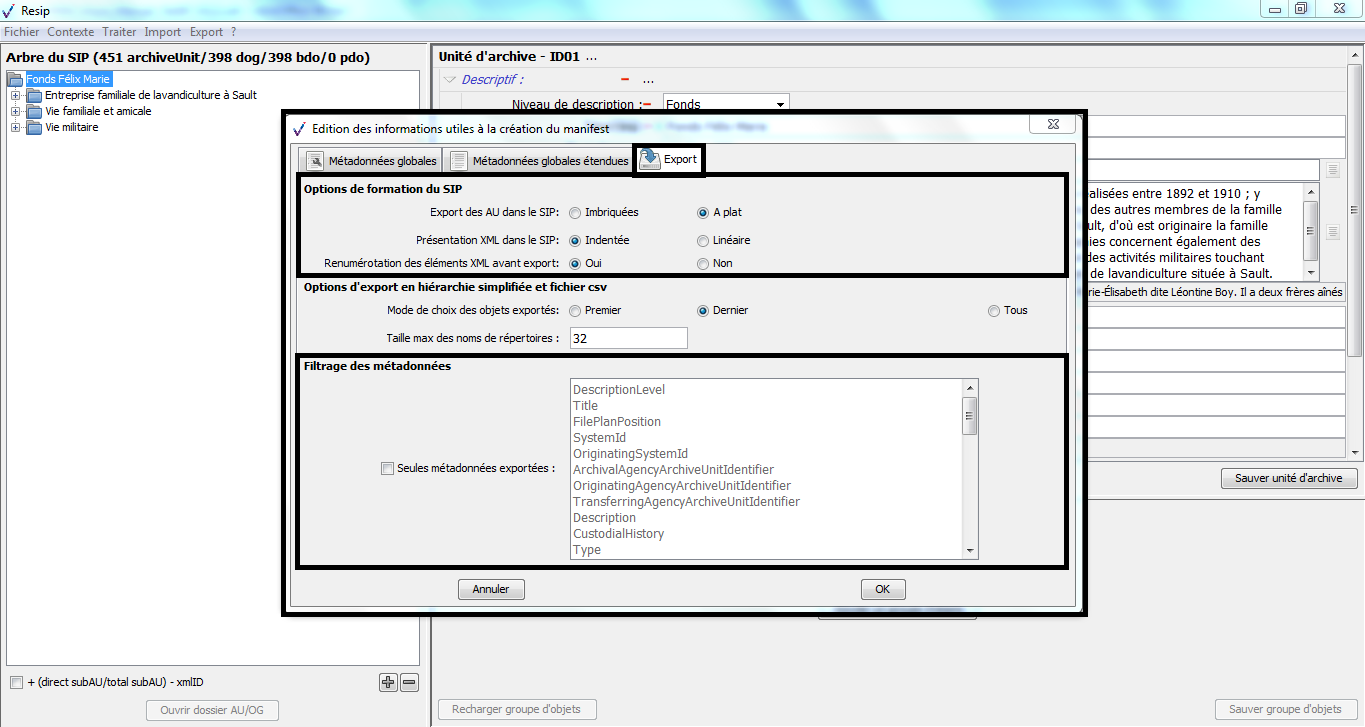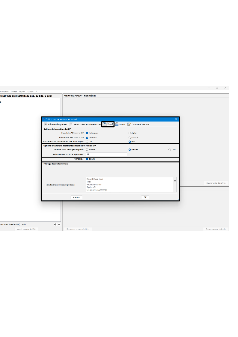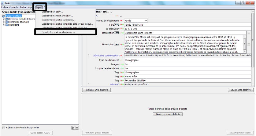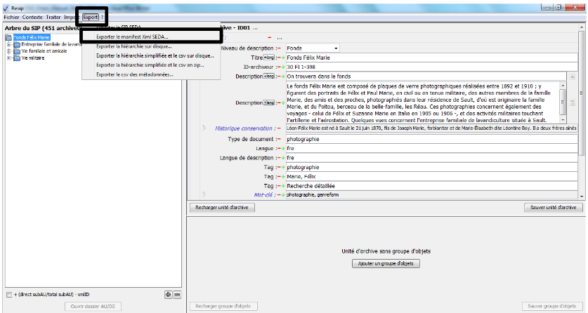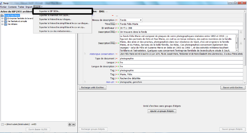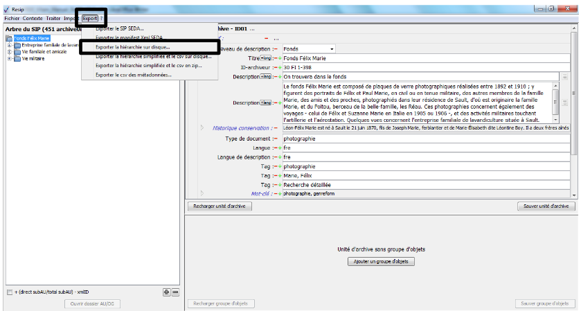 d’exporter les structures arborescentes d’archives et les fichiers qui les représentent sous une forme importable dans la solution logicielle Vitam ou sous la forme d’une arborescence de fichiers.