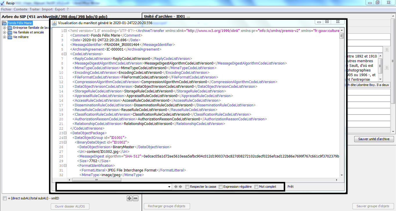 Génération du manifeste SEDA sous forme de fichier XML indenté |