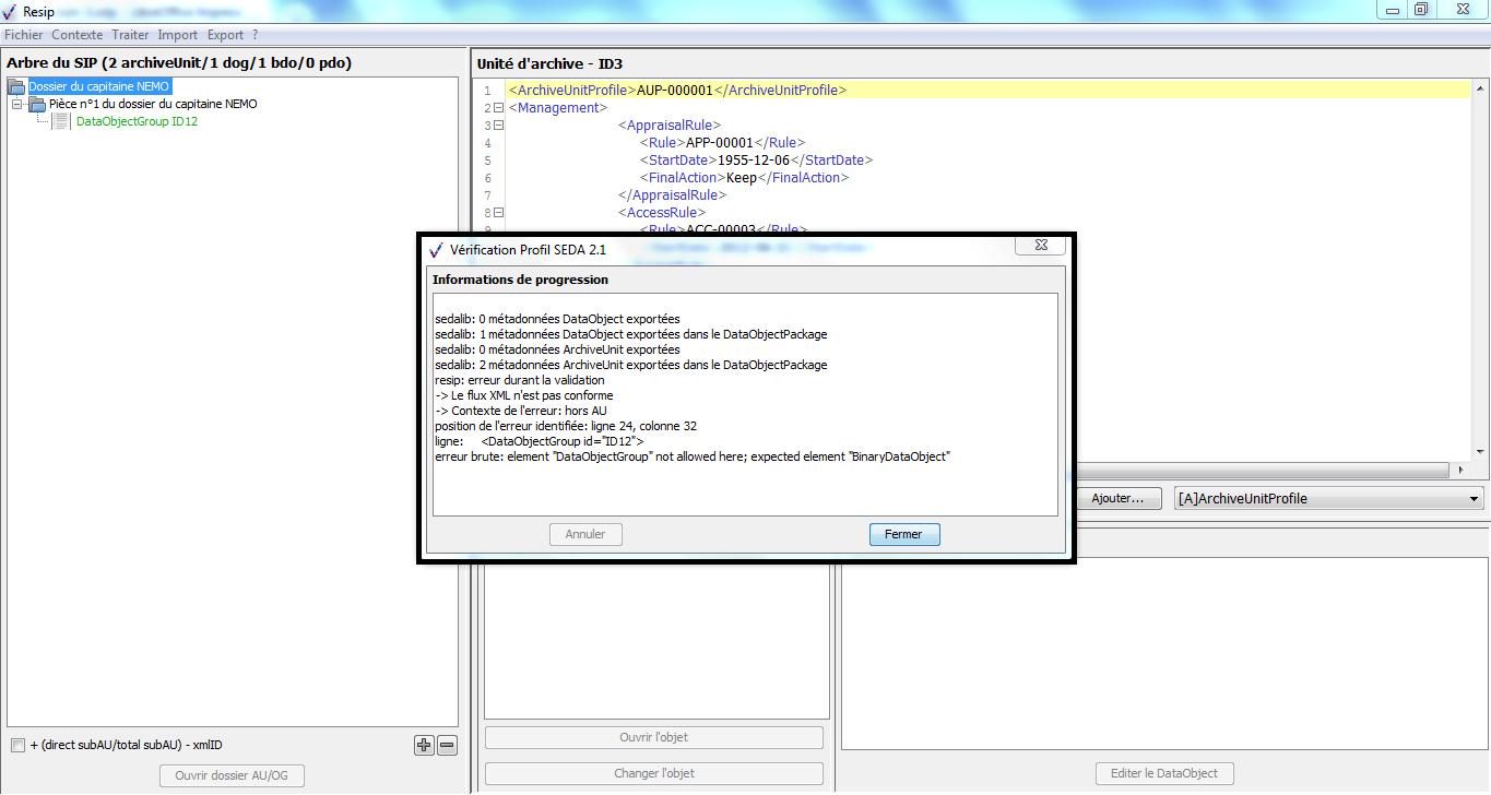 Import d’une structure arborescente d’archives depuis un SIP SEDA avec, comme argument, le nom du fichier « XXX » |