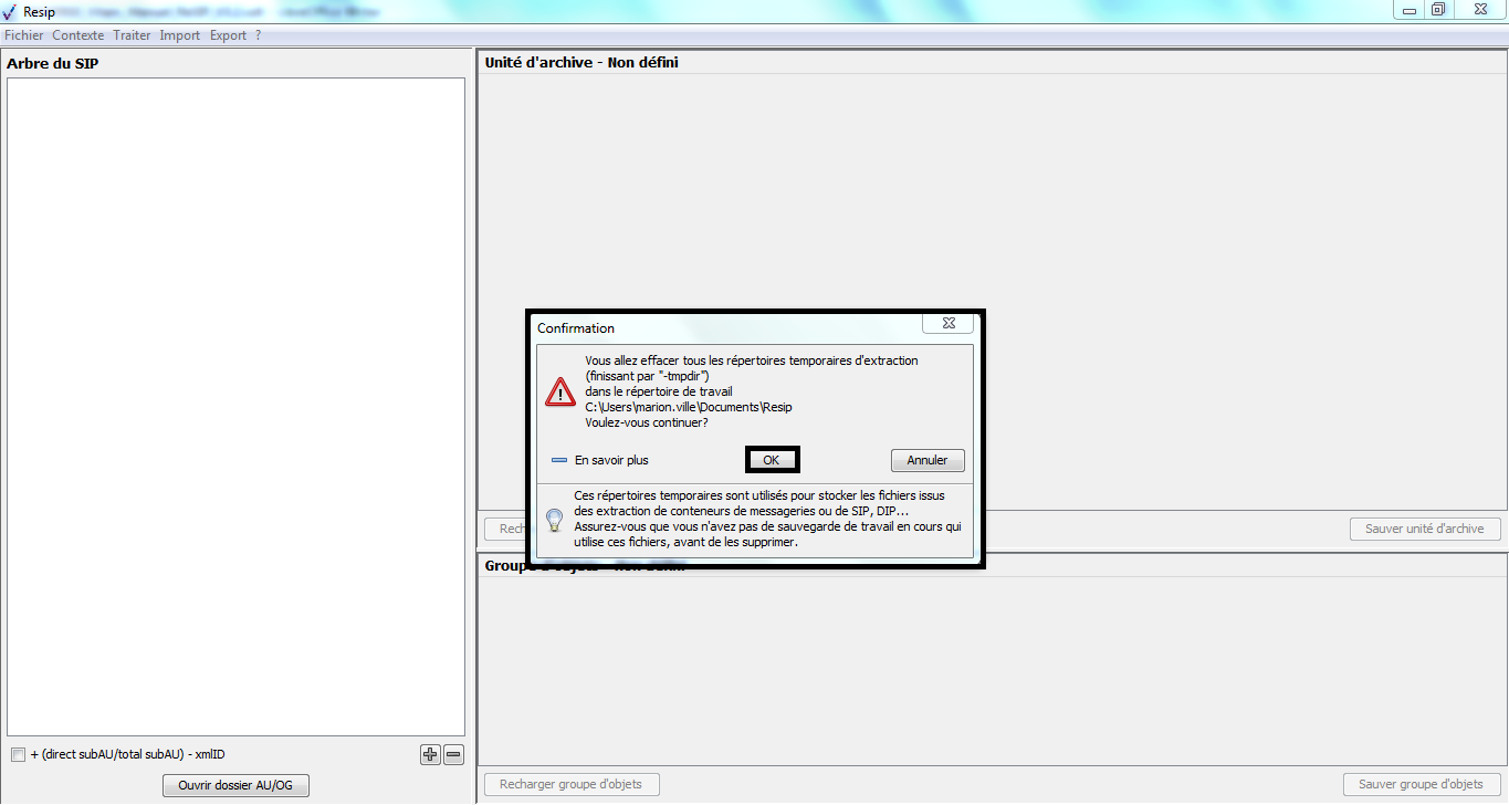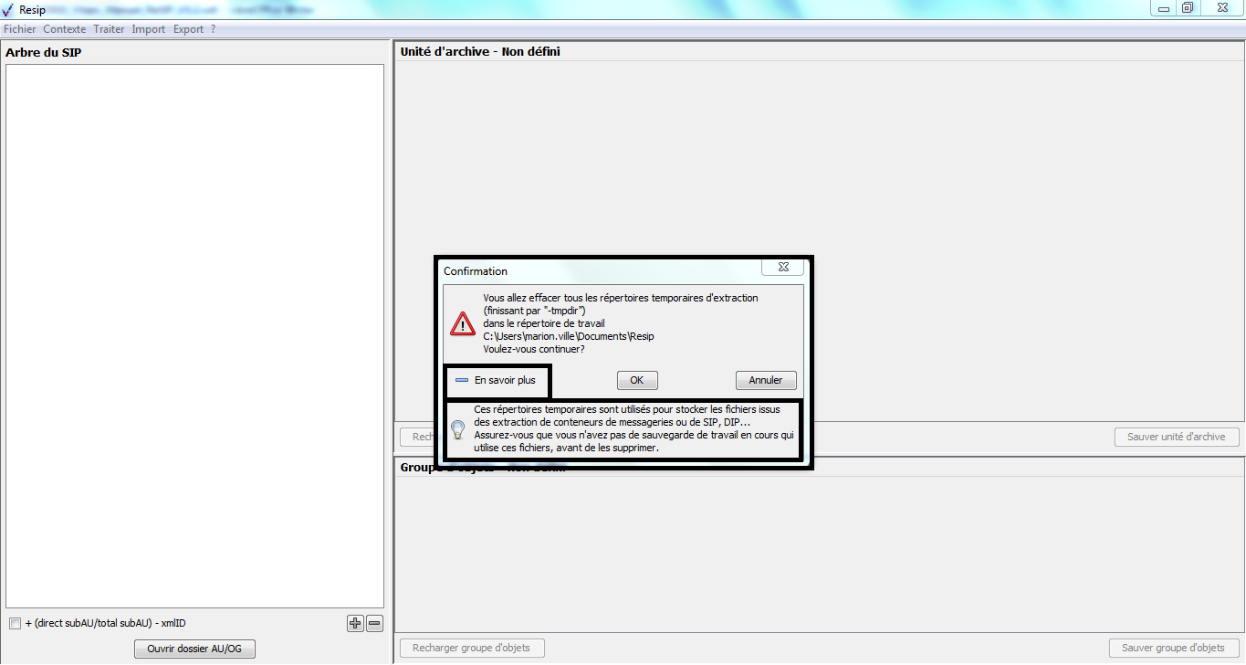 Désignation du répertoire de travail utilisé pour enregistrer les logs et les répertoires d’extraction temporaire (par défaut%User %/Documents/ReSip ou celui défini dans les préférences de l’interface graphique) |
