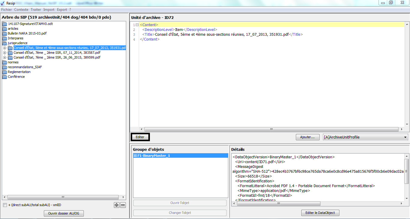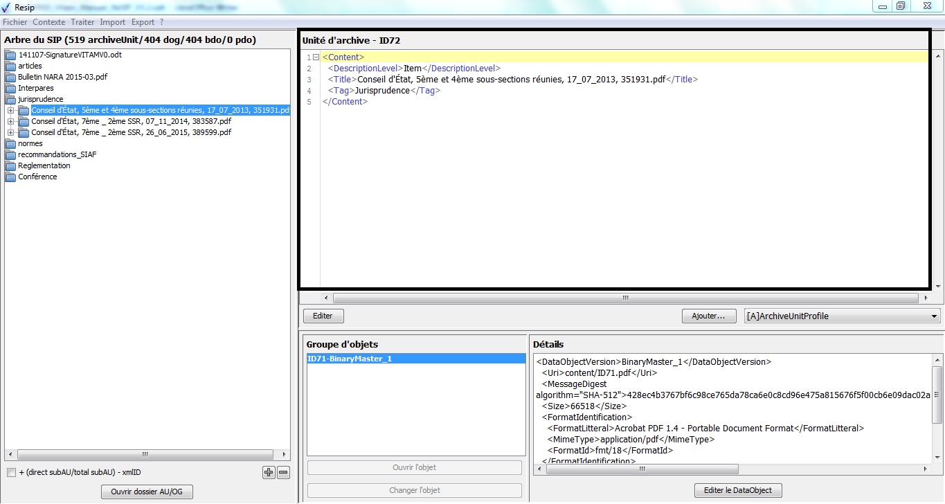 la description intellectuelle de ces archives, décrites dans un bloc intitulé Content pour chaque ArchiveUnit ;