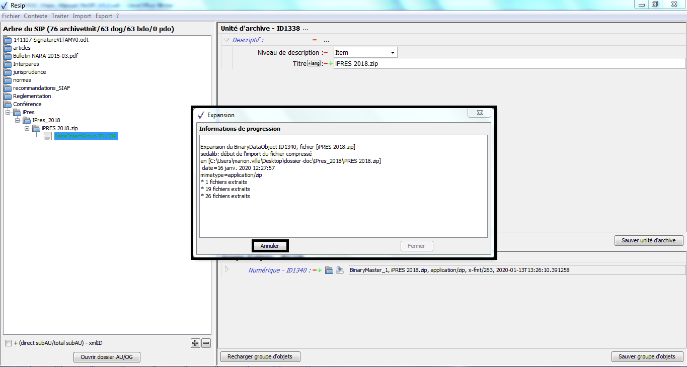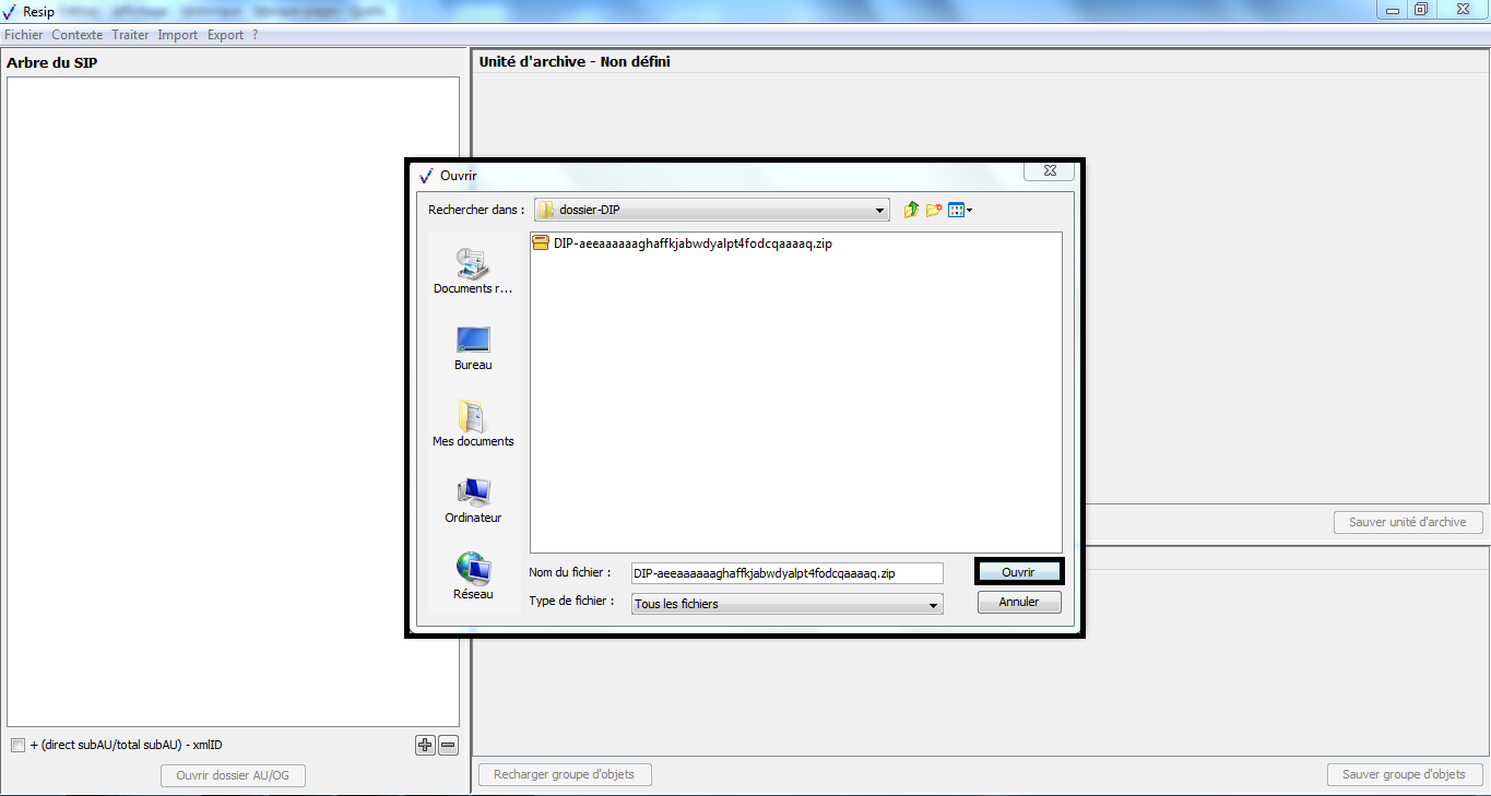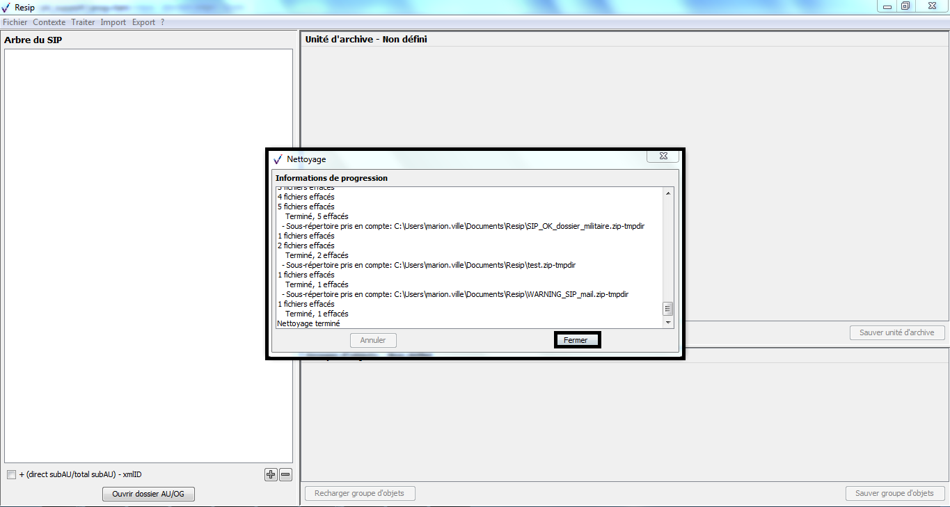 Une fois l’opération de génération du SIP terminée, la fenêtre de dialogue invite l’utilisateur à appuyer sur la touche « Entrée » pour la fermer. Le SIP généré est enregistré dans le répertoire Resip, sous la forme d’un fichier dont l’extension est .zip (cf. copie d’écran ci-dessous).