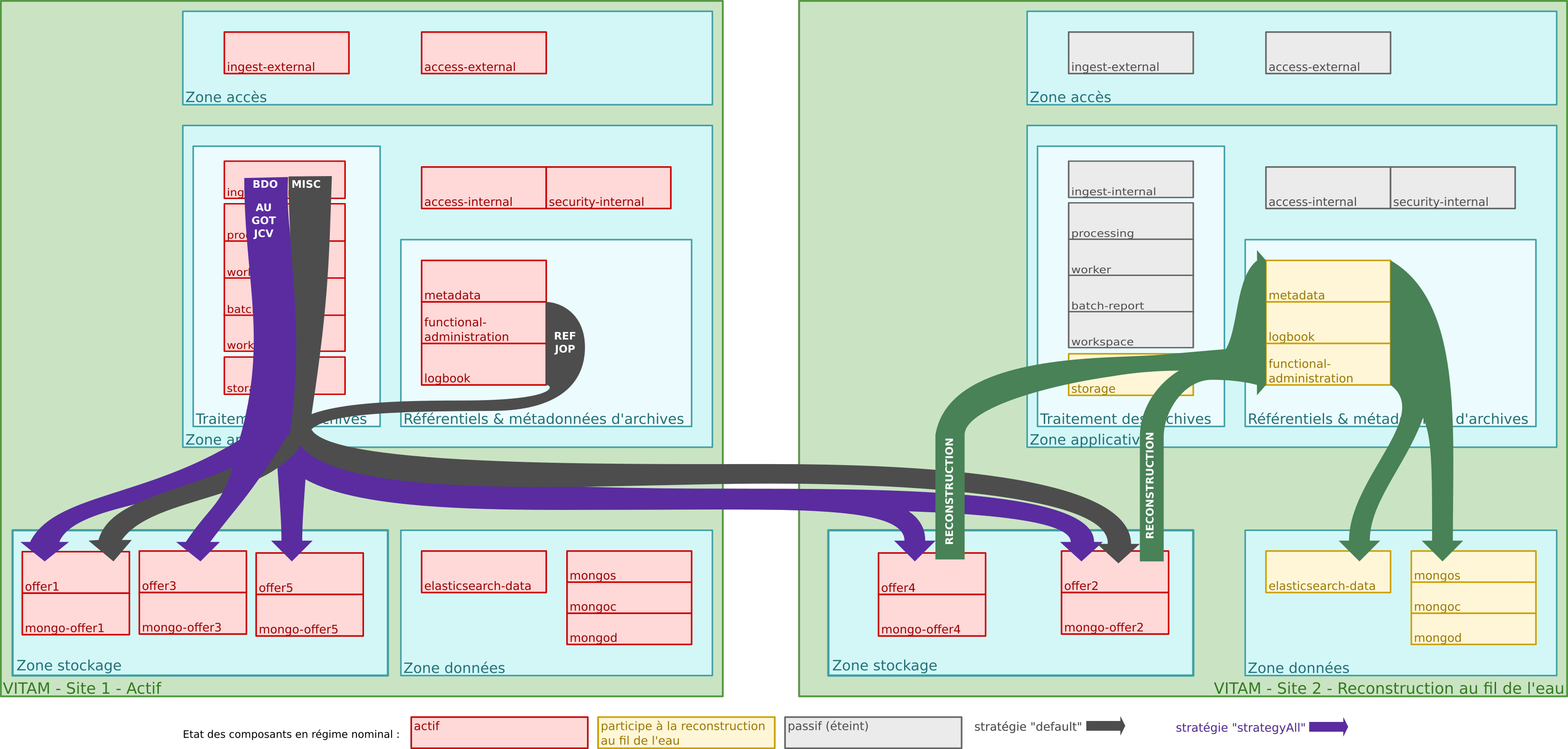 La solution logicielle Vitam est déployée par défaut avec une seule stratégie de stockage et au moins deux offres de stockage pour un support de toutes les fonctions de PCA/PRA. C’est le mode de déploiement conseillé.