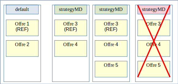 Dans le cas du mode multi-stratégies la reconstruction au fil de l’eau des métadonnées se fera à partir de toutes les offres référentes définies par les stratégies déployées sur la plate-forme. Pour rester performant sur cette reconstruction il est faut être vigilant sur la configuration de plate-forme pour éviter de reconstruire plusieurs fois les mêmes métadonnées. De ce fait il est nécessaire de s’assurer de respecter les règles suivantes :