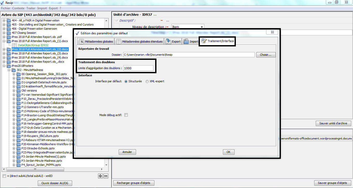 Désignation du répertoire de travail utilisé pour enregistrer les logs et les répertoires d’extraction temporaire (par défaut%User %/Documents/ReSip ou celui défini dans les préférences de l’interface graphique) |