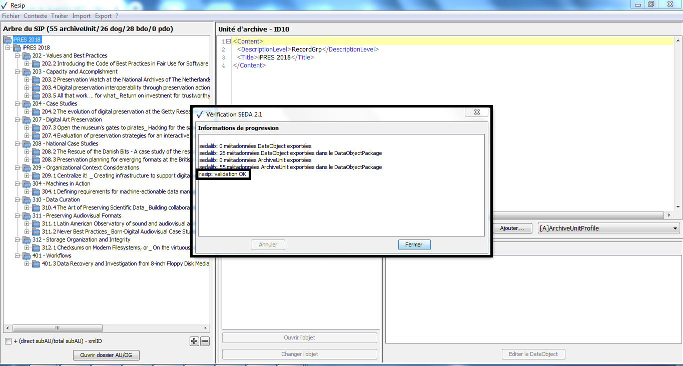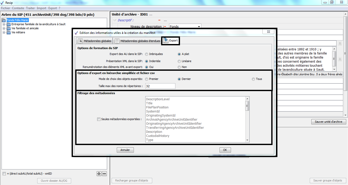 • d’exporter les structures arborescentes d’archives et les fichiers qui les représentent sous une forme importable dans la solution logicielle Vitam ou sous la forme d’une arborescence de fichiers.